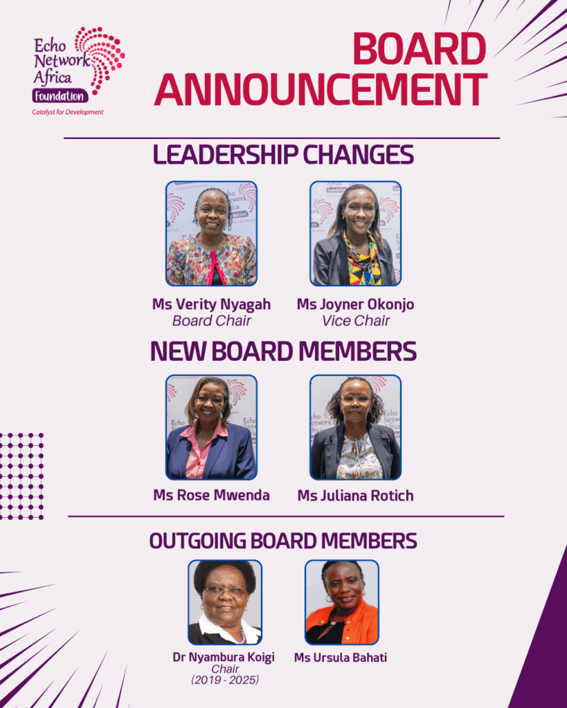 Echo Network Africa Foundation (ENAF) is pleased to announce key developments following its Board meeting held on 17 September 2025. Ms. Verity Nyagah has been appointed as the new Chair of the Board, with Ms. Joyner Okonjo taking on the role of Vice Chair. This leadership renewal strengthens ENAF’s governance and positions the organization for its next chapter of impact.